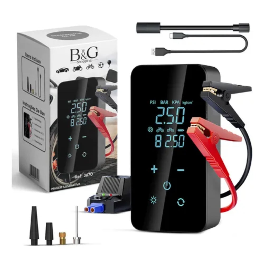 A Bomba de Ar Digital Inteligente com Cabos de Ignição é a solução completa para quem quer segurança, praticidade e autonomia em qualquer situação.